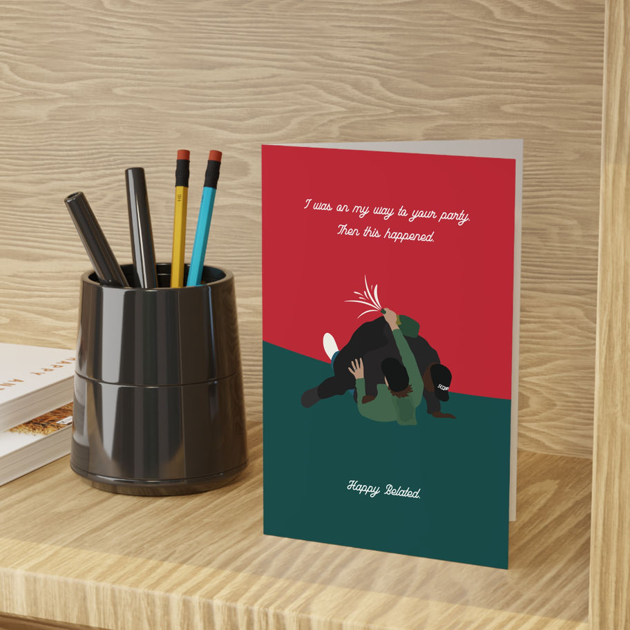 Picture it: You've got the bottle o' champagne, you're on your way to celebrate your best buddy's big moment, and then you get absolutely sacked and miss the party. At least you can wish them a Happy Belated with this card.